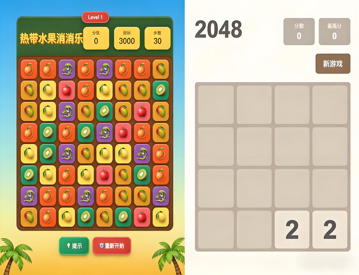1、游戏类作品:消消乐、2048